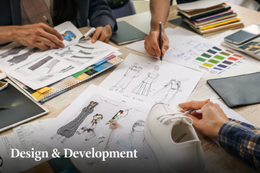 Design confirmation based on trends and client requirements, including sketches, technical details, and sample development for both apparel and footwear.